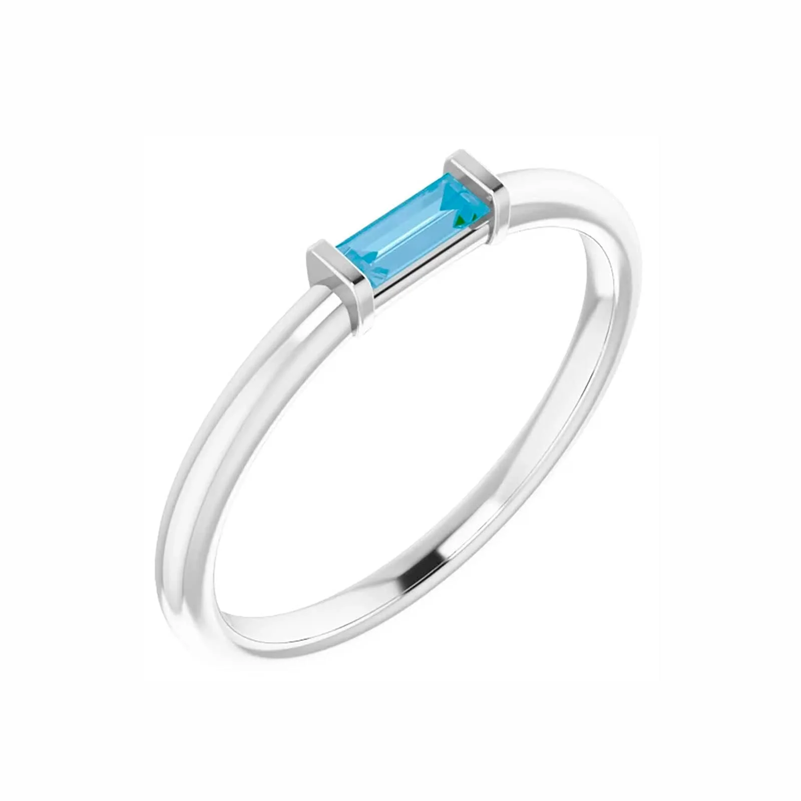 Crafted from 14k white gold and featuring a beautiful Swiss blue topaz baguette, this stackable stunner is perfect for layering with your favorite ring stacksâor wearing solo for a subtle pop of color.