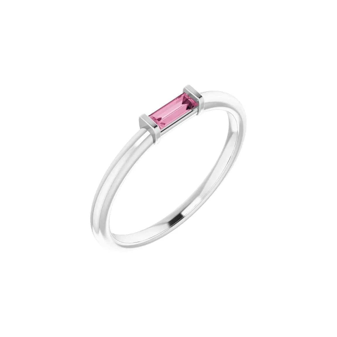 Crafted from 14k white gold and featuring a lovely pink tourmaline baguette, this stackable stunner is perfect for layering with your favorite ring stacks—or wearing solo for a subtle pop of color.