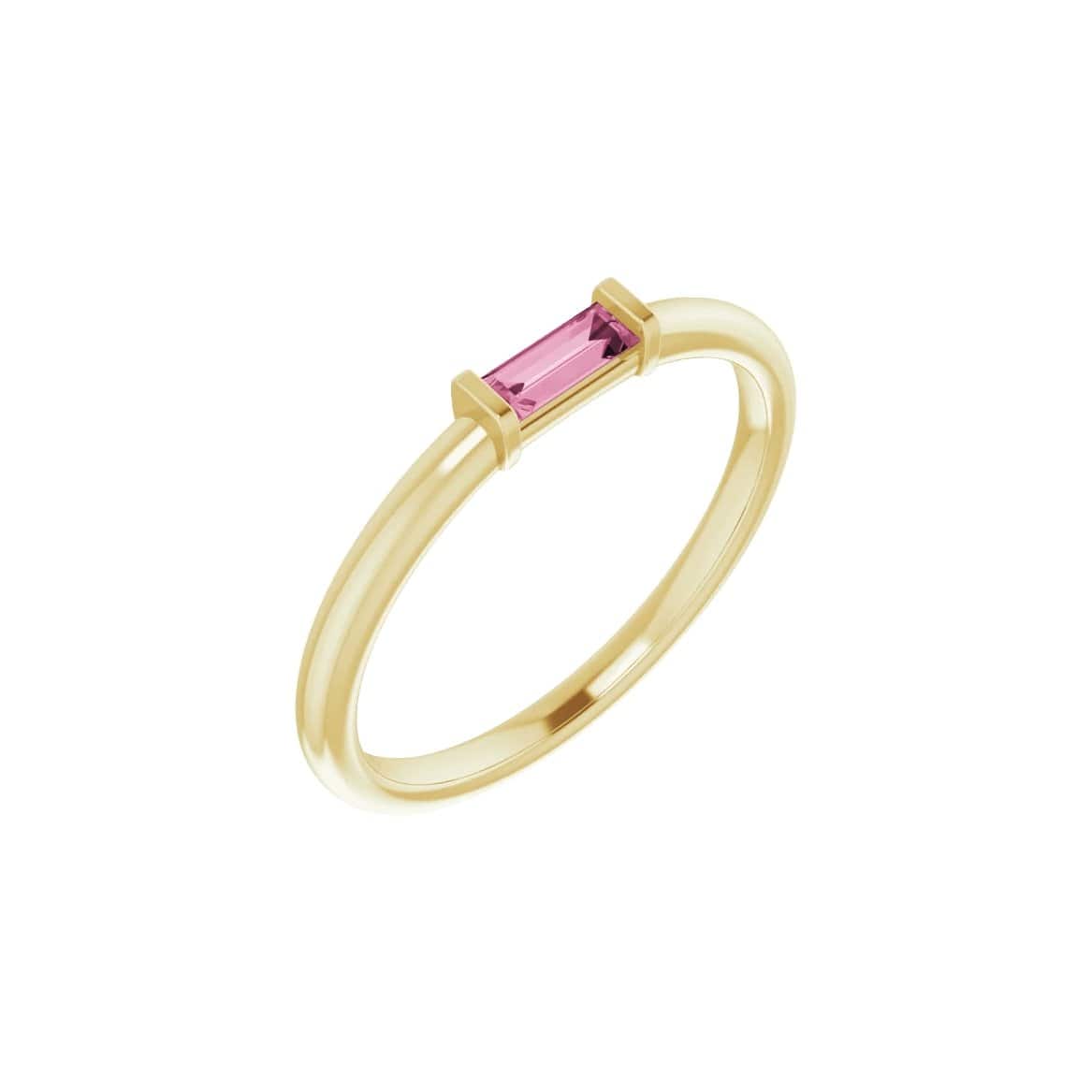 Crafted from 14k yellow gold and featuring a lovely pink tourmaline baguette, this stackable stunner is perfect for layering with your favorite ring stacks—or wearing solo for a subtle pop of color.