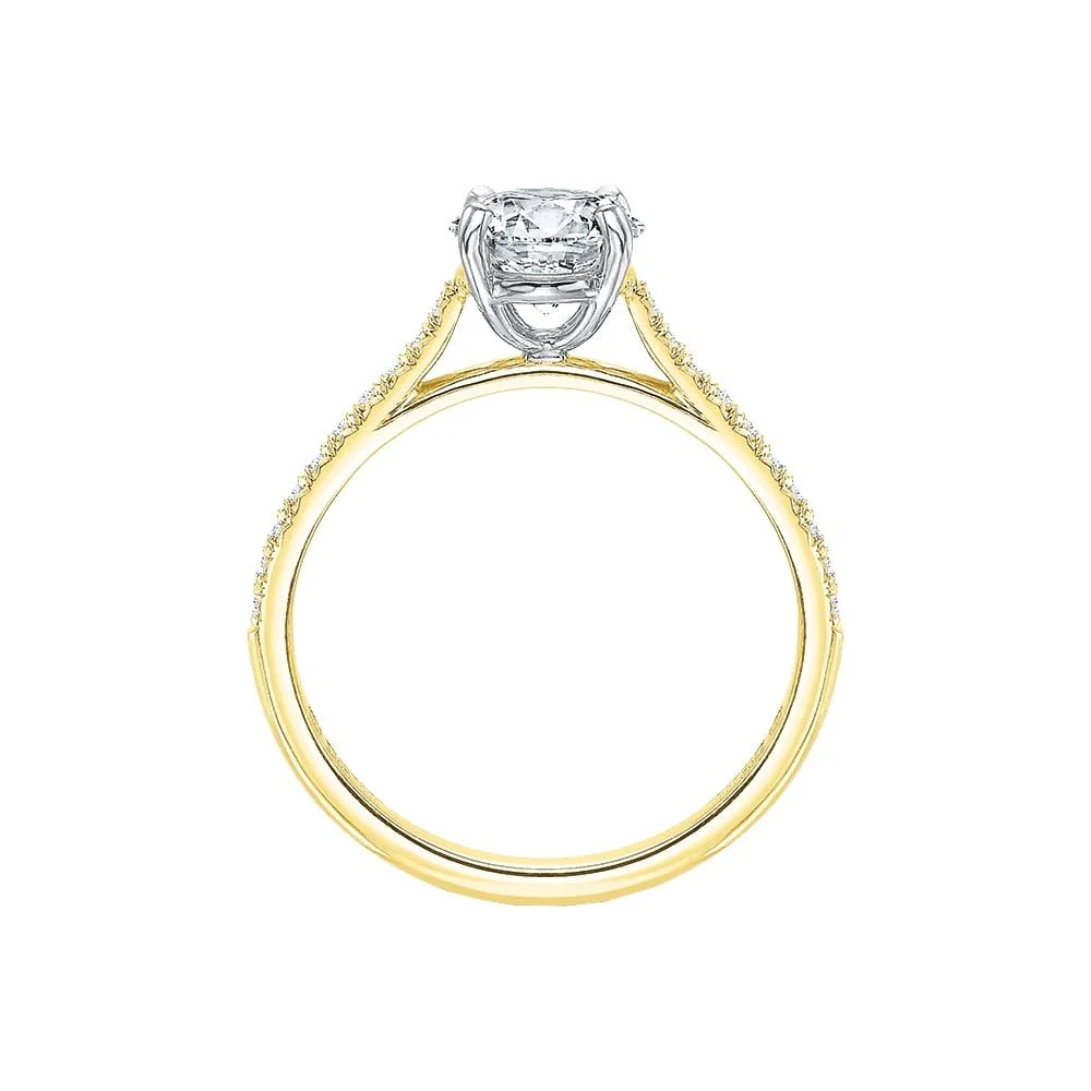 Precision Set's New Aire Semi Mount Ring has a shank crafted from 18k yellow gold with round brilliant diamonds set half way around. The four prong head is made of platinum and waiting for your unique center stone as the finishing touch.