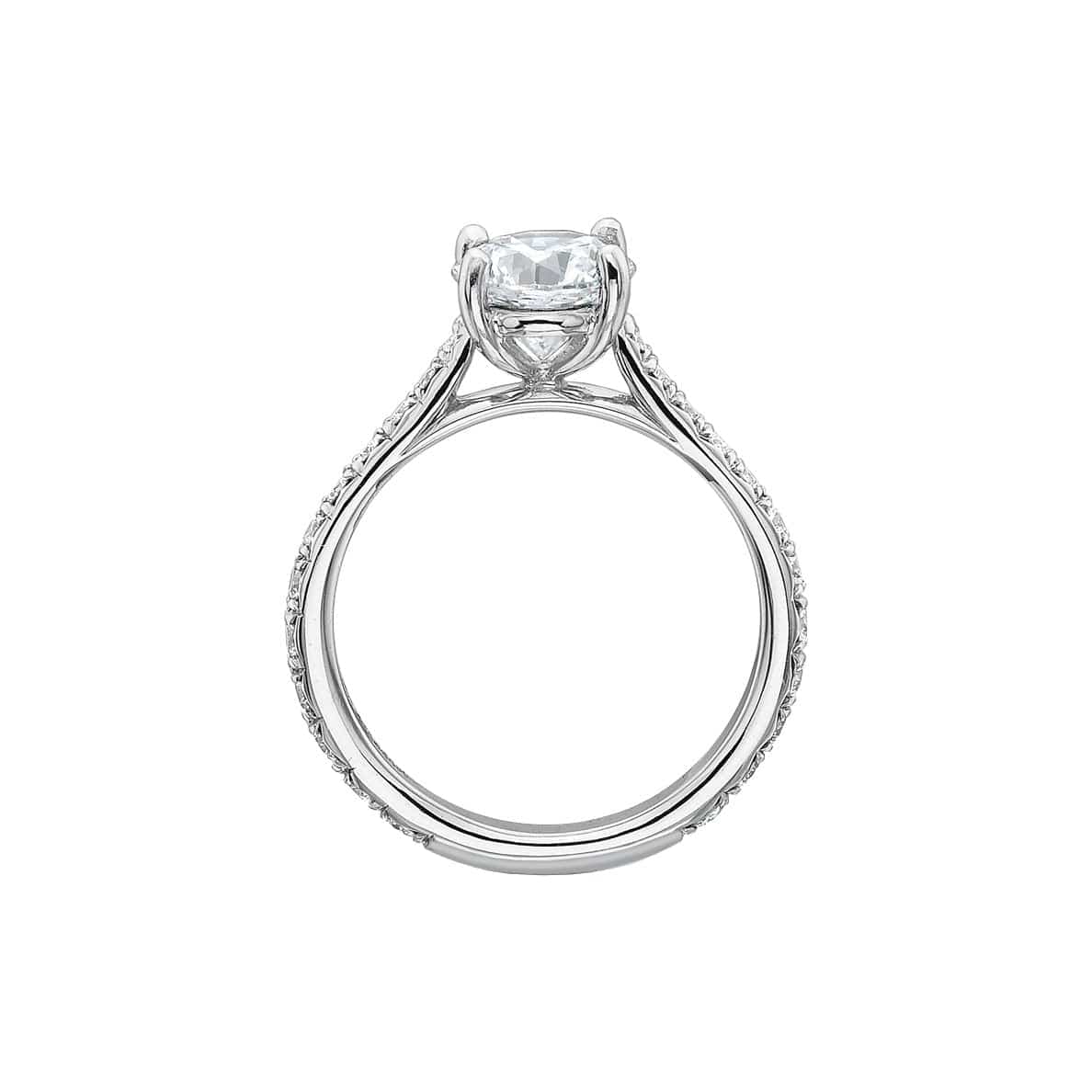 Precision Set's New Aire Semi Mount Ring has a shank crafted from 18k white gold with round brilliant diamonds set three-quarters around. The four prong head is made of platinum and waiting for your unique center stone as the finishing touch.