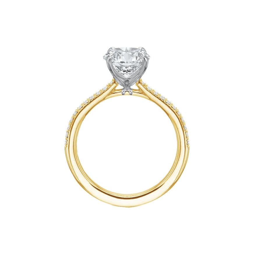 Precision Set's New Aire Low Profile Semi Mount Ring has a shank crafted from 14k yellow gold with round brilliant diamonds set half way around. The four prong head is made of platinum and waiting for your unique center stone as the finishing touch.