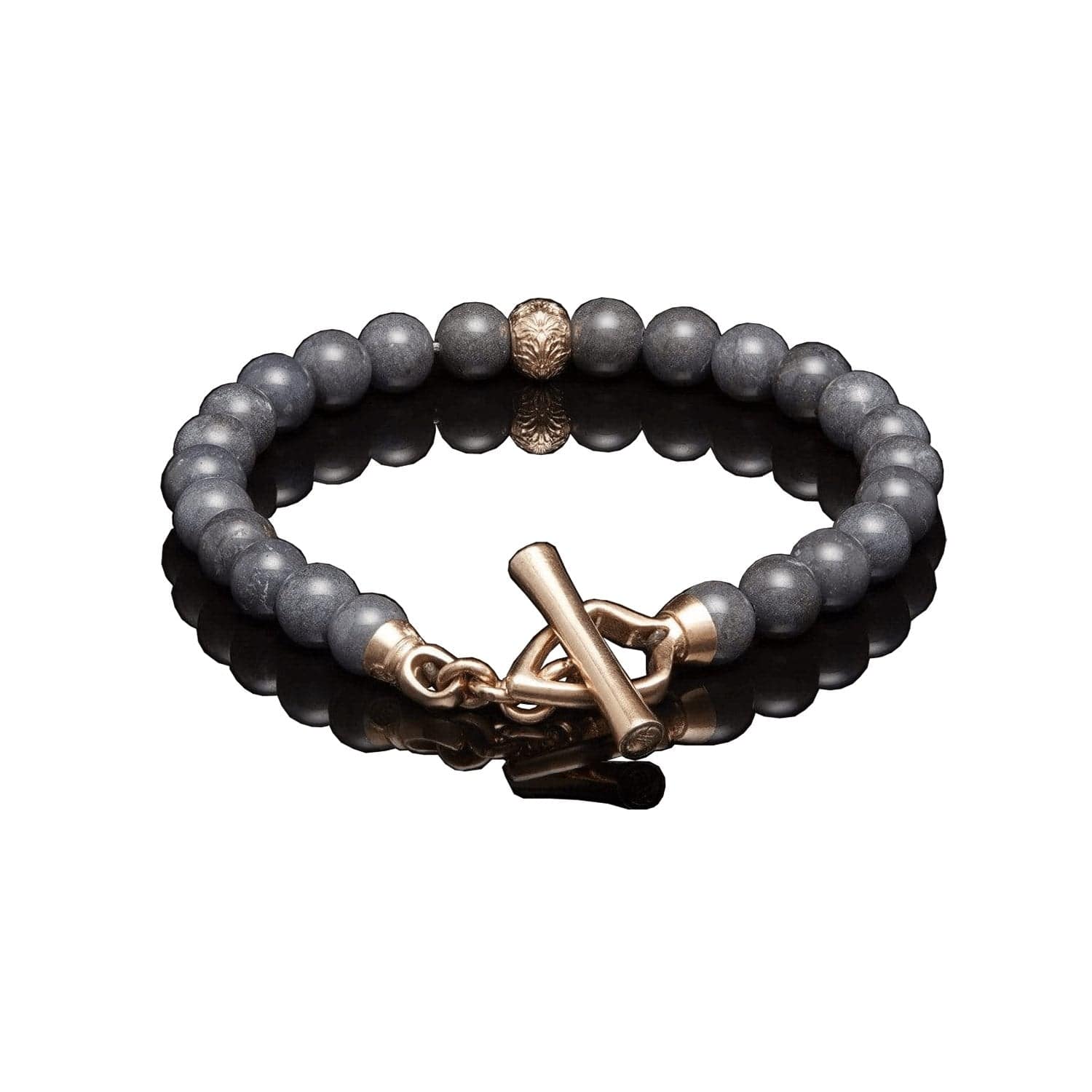 As soon as they saw the perfect rich grey of this jasper (found only in Oregon, William Henry's home state), they knew they had to design something that paired it with rose gold. The ‘Bandon’ bracelet brings it all together, with a solid 18K rose gold center bead and ‘arrow’ toggle clasp, as luxury accents to the beautiful stone beads. Built on welded aircraft cable to last for generations. Less is, in this case, definitely more.