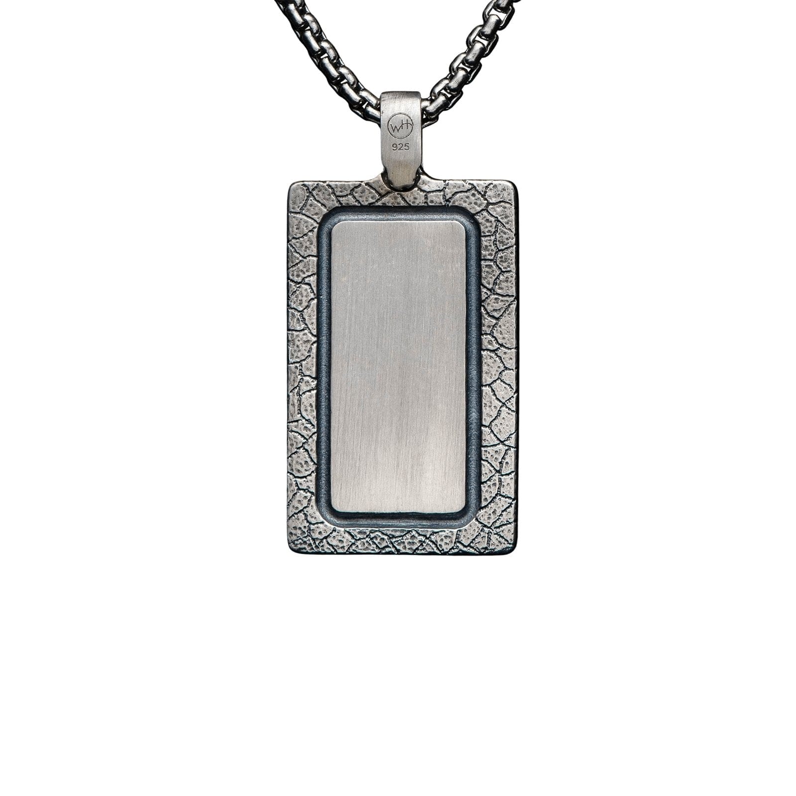 Subtle and simple often speaks the loudest – and the ‘Blue Mammoth Pinnacle’ tells a remarkable story. This dog tag showcases fossil woolly mammoth tooth (6000+ years old) inlaid into sterling silver, with a satin finished engraving panel on the reverse side. Offered on a sterling silver chain. Elegant on its own, dramatic combined with other pieces, always relevant for any ensemble.