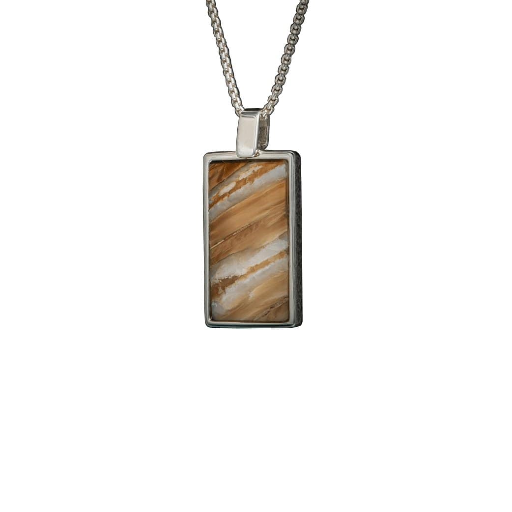 Subtle and simple often speaks the loudest – and the ‘Mammoth Shift’ tells a remarkable story. This mini dog tag showcases fossil wooly mammoth tooth (6000+ years old) inlaid into sterling silver, with a satin finished engraving panel on the reverse side. Offered on a sterling silver chain. Elegant on its own, dramatic combined with other pieces, always relevant for any ensemble.