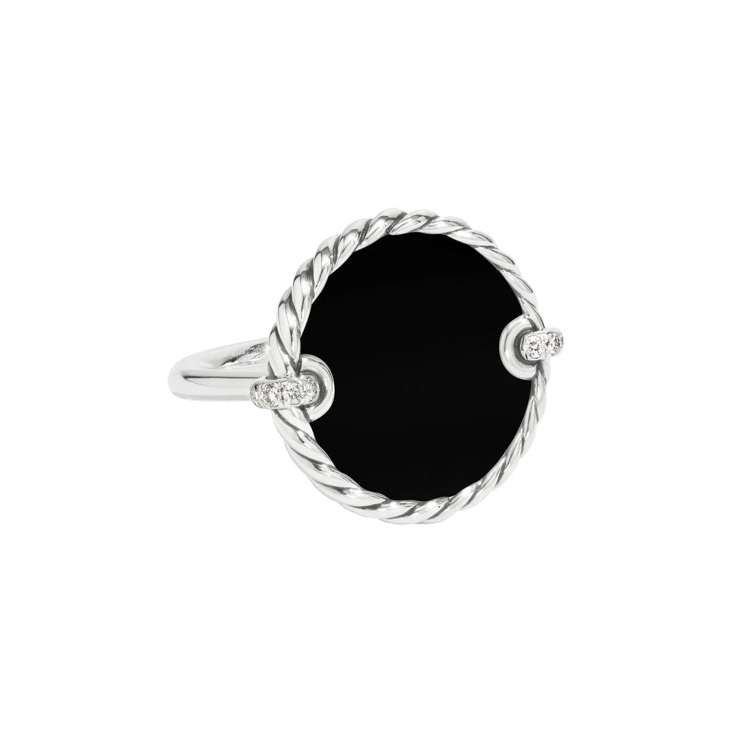 In this collection, David Yurman explores the circle - a timeless symbol of unity; a shape without beginning or end. Crafted from sterling silver, this DY Elements ring features an 18mm black onyx inlay accented with round brilliant diamonds.