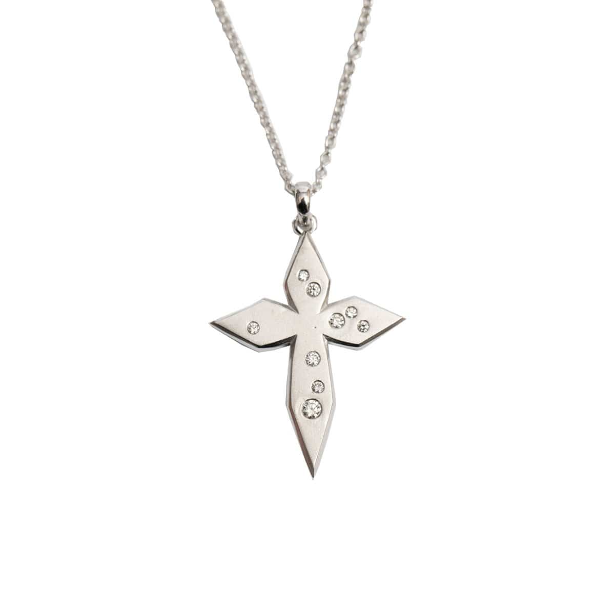 This unique Cross necklace has a modern, edgy look with it's nine scattered diamonds. Choose between 14k yellow or white gold, it's the perfect way to make a statement.