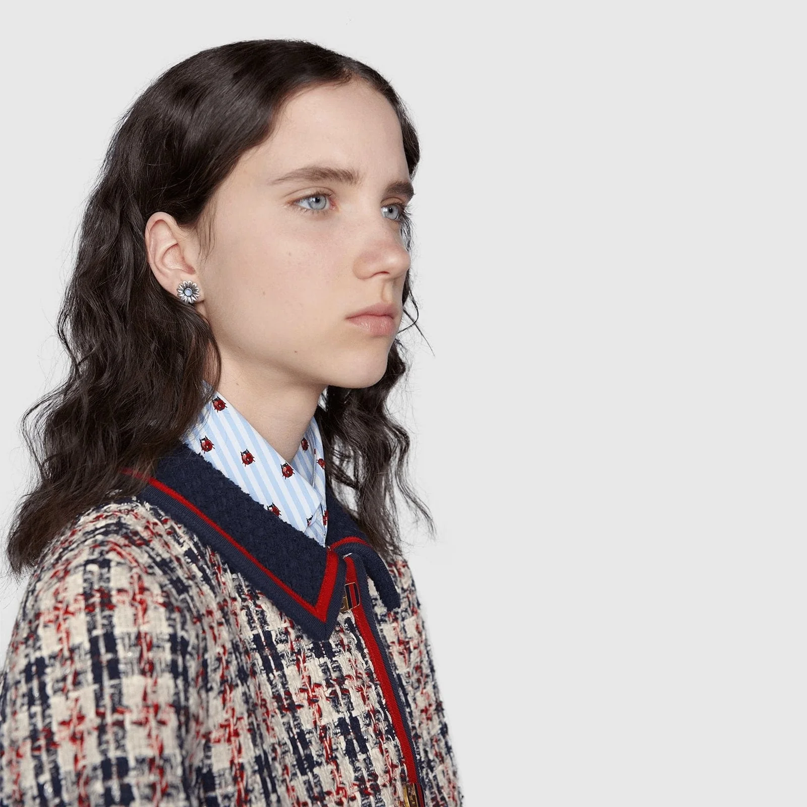 In Gucci's kaleidoscopic narrative, the fascination for the world of nature mixes with codes that pay homage to the House's history. An archival reprisal of the House's signature emblem the Double G defines one of the stud earrings, while the other features a flower encrusted with a blue topaz stone at the center.