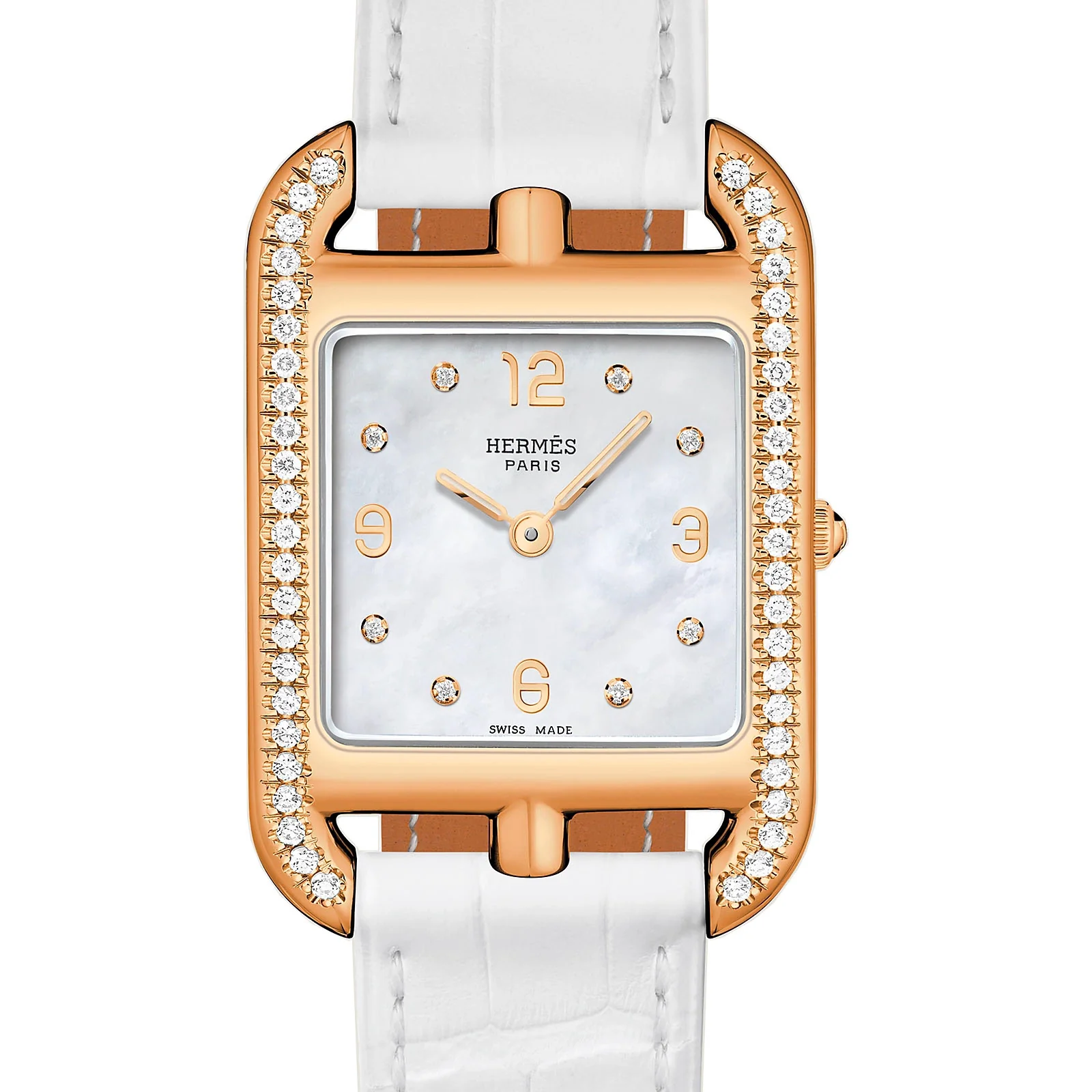 Diamond-set yellow gold watch, dropped setting, quartz movement, white mother-of-pearl dial, long interchangeable strap in matte chantilly alligator